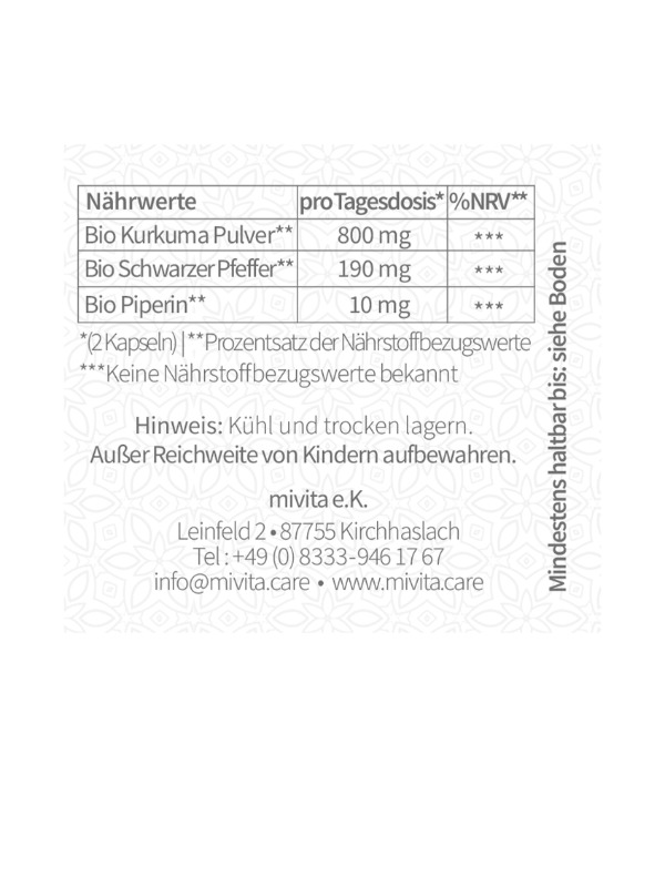 MIVITA Bio Kurkuma Kapseln mit besonders hohem Anteil an "Curcumin" plus Piperin, aus hochwertigem schwarzen Bio Pfeffer für eine deutlich bessere Aufnahme von Kurkuma im Körper. Dadurch erzielen wir die bestmögliche Bio Qualität.